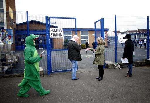 People arrive to vote at a polling station in West Belfast, Northern Ireland, Thursday, March 2, 2017. Voting has begun Thursday in the British province of Northern Ireland to elect a new Stormont Assembly after the power-sharing government collapsed in January. (AP Photo/Peter Morrison)