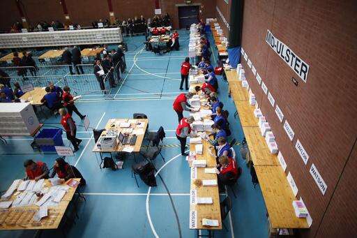Election workers continue to tally up votes in the count centre in Ballymena, Northern Ireland, Friday, March 3, 2017. Counting has begun across Northern Ireland with Irish Nationalists seeking to boost their vote in an early election that could shape the fate of the Catholic-Protestant cooperation in Northern Ireland. (AP Photo/Peter Morrison)