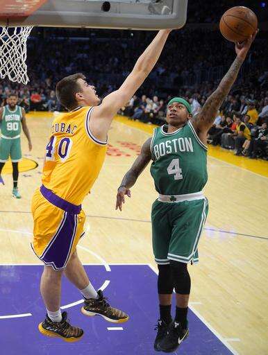 Boston closed the first half on a 19-6 run, with five different players contributing, led by Thomas' six points. A pair of 3-pointers by Nick Young accounted for the Lakers' only points.