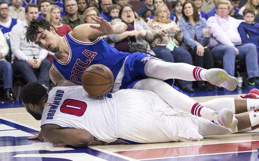 Philadelphia 76ers' Dario Saric, top, tries to go after the loose ball but since it hit Detroit Pistons' Andre Drummond, bottom, and he is out of bounds it remains 76ers ball during the first half of an NBA basketball game, Saturday, March 4, 2017, in Philadelphia. (AP Photo/Chris Szagola) The Associated Press