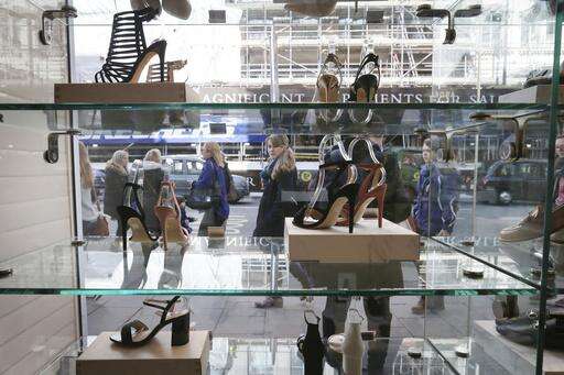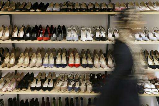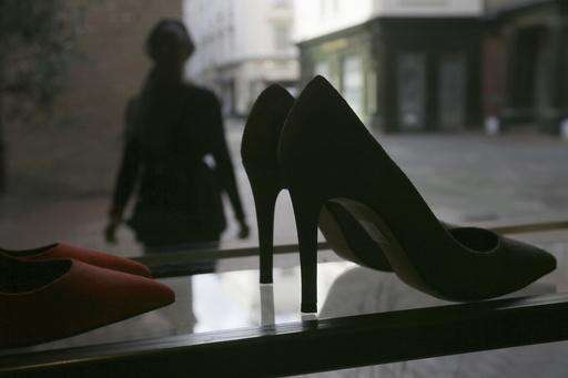 People walk past high heels on display in a shoe store on Oxford Street, London, Monday, March 6, 2017. Members of Parliament on Monday will debate banning mandatory workplace high heels, in response to a petition by a receptionist who was sent home for wearing flat shoes. The petition, which calls formal workplace dress codes "outdated and sexist," gathered more than 150,000 signatures, making it eligible for a non-binding debate in Parliament. (AP Photo/Tim Ireland)