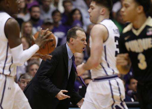 Northwestern head coach Chris Collins reacts after guard Bryant McIntosh scored a basket against Purdue during the second half of an NCAA college basketball game, Sunday, March 5, 2017, in Evanston, Ill. Purdue won 69-65. (AP Photo/Nam Y. Huh) The Associated Press
