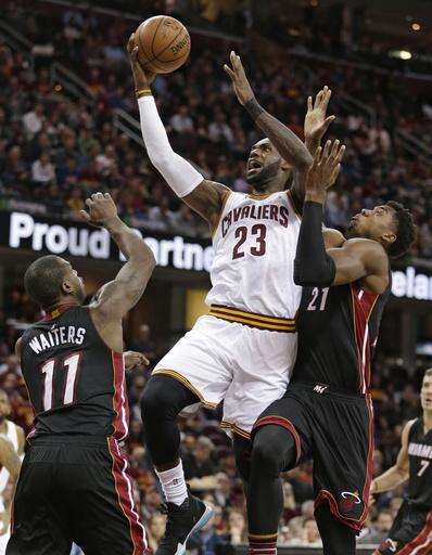 Cleveland Cavaliers' LeBron James (23) drives to the basket against Miami Heat's Dion Waiters (11) and Hassan Whiteside (21) in the first half of an NBA basketball game, Monday, March 6, 2017, in Cleveland. (AP Photo/Tony Dejak) The Associated Press