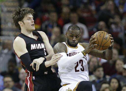 Cleveland Cavaliers' LeBron James (23) grabs a rebound ahead of Miami Heat's Luke Babbitt (5) in the first half of an NBA basketball game, Monday, March 6, 2017, in Cleveland. (AP Photo/Tony Dejak) The Associated Press