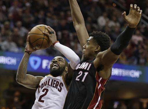 Cleveland Cavaliers' Kyrie Irving (2) shoots against Miami Heat's Hassan Whiteside (21) in the first half of an NBA basketball game, Monday, March 6, 2017, in Cleveland. (AP Photo/Tony Dejak) The Associated Press
