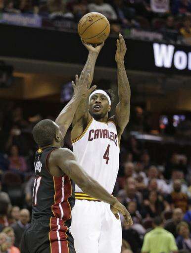 Cleveland Cavaliers' Iman Shumpert (4) shoots over Miami Heat's Dion Waiters (11) in the first half of an NBA basketball game, Monday, March 6, 2017, in Cleveland. (AP Photo/Tony Dejak) The Associated Press