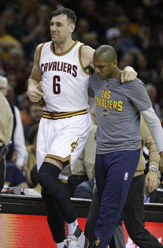 Cleveland Cavaliers' Andrew Bogut (6) is helped off the court by James Jones in the first half of an NBA basketball game against the Miami Heat, Monday, March 6, 2017, in Cleveland. (AP Photo/Tony Dejak) The Associated Press