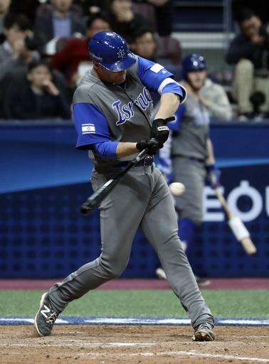Israel's Nate Freiman flies out during the eighth inning of the first round game of the World Baseball Classic against South Korea at Gocheok Sky Dome in Seoul, South Korea, Monday, March 6, 2017. (AP Photo/Lee Jin-man)