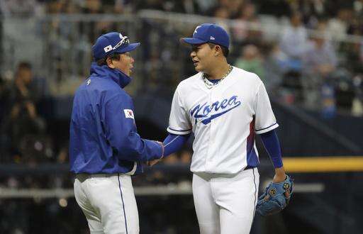 South Korea's pitching coach Son Dongyul, left, takes the ball from pitcher Sim Chang-min before leaving the mound during the sixth inning of a first round game against Israel of the World Baseball Classic at Gocheok Sky Dome in Seoul, South Korea, Monday, March 6, 2017. (AP Photo/Lee Jin-man)