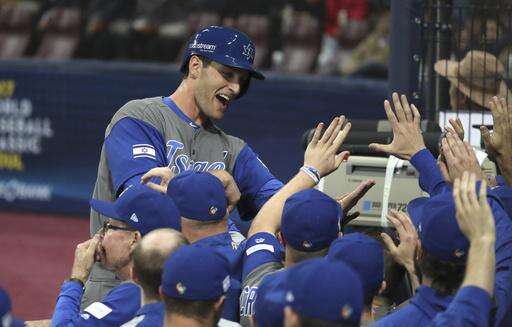Israel's Nate Freiman celebrates with teammates after a forced run against South Korea during the second inning of their first round game of the World Baseball Classic at Gocheok Sky Dome in Seoul, South Korea, Monday, March 6, 2017. (AP Photo/Lee Jin-man)