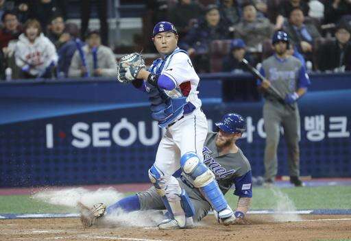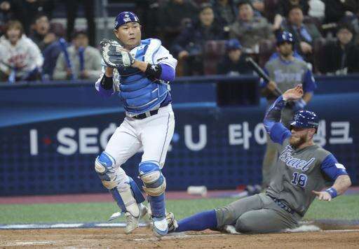 Israel's Zach Borenstein is forced out at home as South Korea's catcher Yang Eui-ji tries to throw to first during the eighth inning of the first round game of the World Baseball Classic at Gocheok Sky Dome in Seoul, South Korea, Monday, March 6, 2017. (AP Photo/Lee Jin-man)