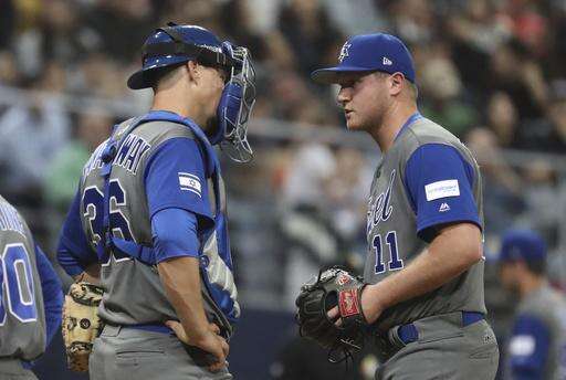 Israel pitcher Gabe Cramer, right, talks with catcher Ryan Lavarnway against South Korea during the sixth inning of the first round game of the World Baseball Classic at Gocheok Sky Dome in Seoul, South Korea, Monday, March 6, 2017. (AP Photo/Lee Jin-man)