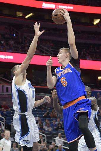 New York Knicks forward Kristaps Porzingis (6) goes up for a shot in front of Orlando Magic forward Aaron Gordon, left, during the first half of an NBA basketball game in Orlando, Fla., Monday, March 6, 2017. (AP Photo/Phelan M. Ebenhack) The Associated Press