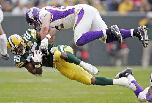 FILE - In this Nov. 11, 2007, file photo, Green Bay Packers running back Ryan Grant (25) is hit by Minnesota Vikings linebacker Chad Greenway (52) during the first half of an NFL football game in Green Bay, Wis. Greenway is retiring. The team says Greenway will announce his retirement at a news conference Tuesday, March 7, 2017, at Vikings headquarters. The 34-year-old Greenway played 11 seasons and appeared in 156 career games with 144 starts for Minnesota. He ranks fourth in franchise history with 1,334 career tackles.(AP Photo/Mike Roemer, file) The Associated Press