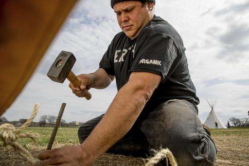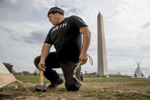Aldo Seoane of the Yoeme tribe, with a group protesting the Dakota Access oil pipeline, helps set up teepees on the National Mall near the Washington Monument in Washington, Tuesday, March 7, 2017. A federal judge declined to temporarily stop construction of the final section of the disputed Dakota Access oil pipeline, clearing the way for oil to flow as soon as next week. (AP Photo/Andrew Harnik) The Associated Press