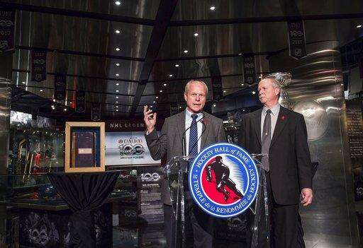 Mark, left, and Marty Howe speak at the Hockey Hall of Fame for the unveiling of their Centennial Exhibit and a statue of their father, Gordie Howe, in Toronto on Friday, March 10, 2017. (Aaron Vincent Elkaim/The Canadian Press via AP) The Associated Press