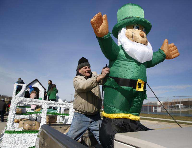 Danny Holt of Chicago secures an inflatable leprechaun in the bed of his truck before the West Suburban Irish's 24th annual St. Patrick's Day parade Saturday in Naperville. Daniel White/dwhite@dailyherald.com