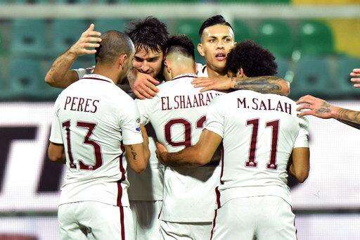 Roma's Stephan El Shaarawy, back to camera, celebrates with teammates after scoring during a Serie A soccer match between Palermo and Roma at the Renzo Barbera stadium in Palermo, Italy, Sunday, March 12, 2017. (Mike Palazzotto/ANSA via AP) The Associated Press