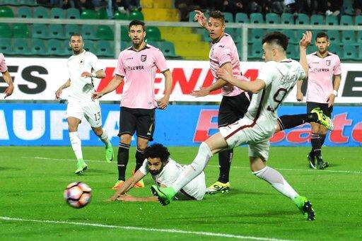 Roma's Stephan El Shaarawy, right, scores the opening goal during a Serie A soccer match between Palermo and Roma at the Renzo Barbera stadium in Palermo, Italy, Sunday, March 12, 2017. (Mike Palazzotto/ANSA via AP) The Associated Press