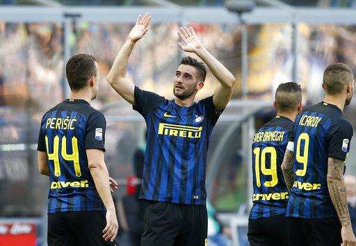 Inter Milan's Roberto Gagliardini, second from left, waves Atalanta's supporters after scoring during the Serie A soccer match between Inter Milan and Atalanta at the San Siro stadium in Milan, Italy, Sunday, March 12, 2017. (AP Photo/Antonio Calanni) The Associated Press