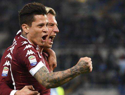 Torino's forward Maxi Lopez celebrates with teammate Juan Iturbe after scoring during the Italian Serie A soccer match between Lazio and Torino at the Olympic stadium in Rome, Monday, March 13, 2017. (Maurizio Brambatti/ANSA via AP)