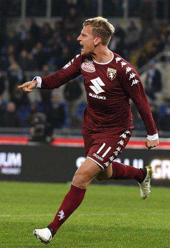 Torino's forward Maxi Lopez celebrates after scoring a goal during the Italian Serie A soccer match between Lazio and Torino at the Olympic stadium in Rome, Monday, March 13, 2017. (Maurizio Brambatti/ANSA via AP)