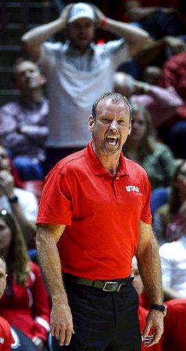 Utah head coach Larry Krystkowiak yells at a referee over a call in the first round of an NIT college basketball game against Boise State in Salt Lake City on Tuesday, March 14, 2017. (Steve Griffin/The Salt Lake Tribune via AP)