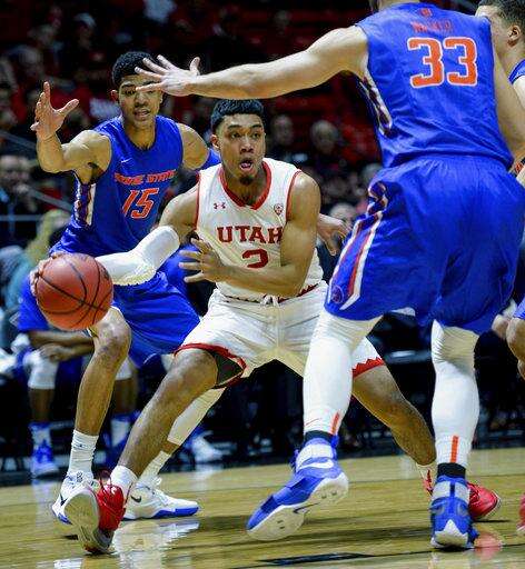 Utah guard Sedrick Barefield (2) looks to pass the ball against Boise State in the first round of an NIT college basketball game in Salt Lake City on Tuesday, March 14, 2017. (Steve Griffin/The Salt Lake Tribune via AP)