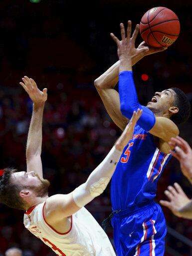 Utah guard Devon Daniels (3) shoots over Boise State forward David Wacker (33) in the first round of an NIT college basketball game in Salt Lake City on Tuesday, March 14, 2017. (Steve Griffin/The Salt Lake Tribune via AP)
