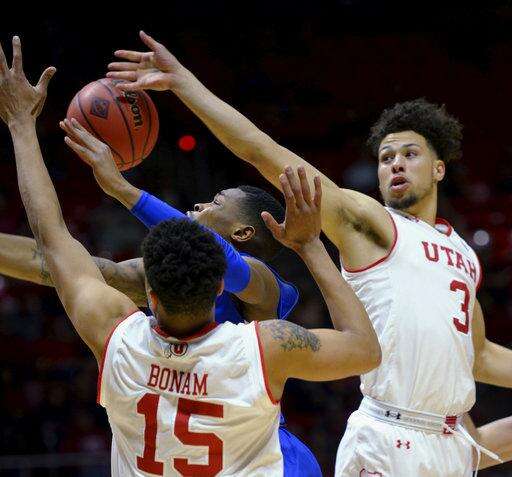 Utah guards Lorenzo Bonam (15) and Devon Daniels (3) team up to block the shot of Boise State guard Paris Austin (30) in the first round of an NIT college basketball game in Salt Lake City on Tuesday, March 14, 2017. (Steve Griffin/The Salt Lake Tribune via AP)