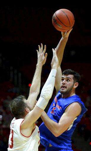 Boise State forward Zach Haney, right, hooks a shot over Utah forward David Collette (13) in the first round of an NIT college basketball game in Salt Lake City on Tuesday, March 14, 2017. (Steve Griffin/The Salt Lake Tribune via AP)