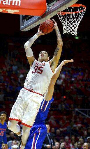 Utah forward Kyle Kuzma (35) goes up for a shot against Boise State in the first round of an NIT college basketball game in Salt Lake City on Tuesday, March 14, 2017. (Steve Griffin/The Salt Lake Tribune via AP)