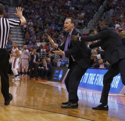 The eighth-seeded Wildcats (24-12) got the ball down to Dererk Pardon for a point-blank shot that was on its way in. Gonzaga 7-footer Zach Collins reached up through the net and deflected the ball out. No whistle blew. Gonzaga got the rebound and started down court. Collins ran onto the court, charged toward the referee and gestured as if he were knocking a ball out of the hoop from the bottom.