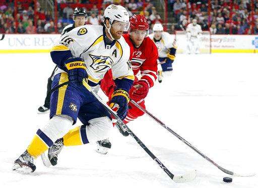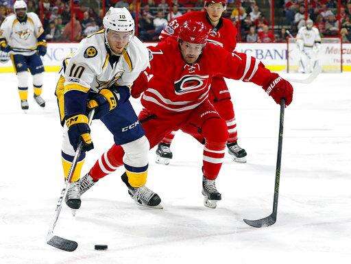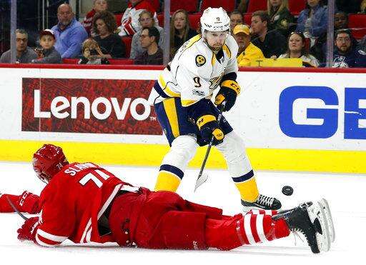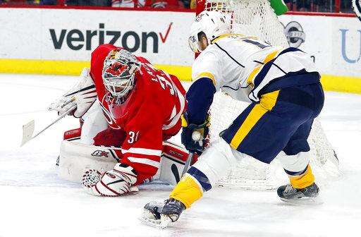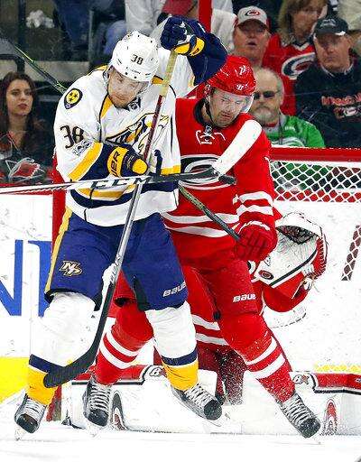NOTES: The Hurricanes have never shut out Nashville in 24 all-time meetings. ... Slavin's two assists gave him a career-high 30 points this season. ... Skinner's second goal gave him 315 points and put him one ahead of Sami Kapanen for seventh on the Hurricanes' career list since the club moved Hartford to North Carolina. ... Lindholm has points in six straight games. ... Stempniak is now on a four-game assist streak. ... Arvidsson is on a four-game point streak. ... Carolina LW Valentin Zykov (upper body) missed his fourth straight game while C Jay McClement (lower body) missed his second straight. D Matt Tennyson was a healthy extra. ... Nashville LW Vernon Fiddler (upper body) missed his fifth straight game. Teammates C Craig Smith, LW Harry Zolnierczyk, D Anthony Bitetto and D Brad Hunt were healthy scratches.