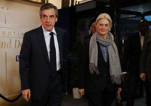 Conservative presidential candidate Francois Fillon, left, and his wife Penelope arrive for a television debate at French TV station TF1 in Aubervilliers, outside Paris, France, Monday, March 20, 2017. The five leading candidates for France's presidential election are holding their first debate Monday, with centrist Emmanuel Macron and far-right leader Marine Le Pen leading polls and jobs and security among voters' top concerns. (Patrick Kovarik/Pool Photo via AP) The Associated Press