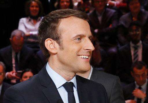 Independent centrist presidential candidate for the presidential election Emmanuel Macron smiles prior to a television debate at French TV station TF1 in Aubervilliers, outside Paris, France, Monday, March 20, 2017. The five leading candidates for France's presidential election are holding their first debate Monday, with centrist Emmanuel Macron and far-right leader Marine Le Pen leading polls and jobs and security among voters' top concerns. (Patrick Kovarik/Pool Photo via AP) The Associated Press