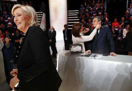 Far-right presidential candidate for the presidential election Marine Le Pen, left, smiles as Conservative presidential candidate Francois Fillon, right, gets his make-up prior to a television debate at French TV station TF1 in Aubervilliers, outside Paris, France, Monday, March 20, 2017. The five leading candidates for France's presidential election are holding their first debate Monday, with centrist Emmanuel Macron and far-right leader Marine Le Pen leading polls and jobs and security among voters' top concerns. (Patrick Kovarik/Pool Photo via AP) The Associated Press