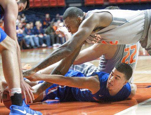 Illinois forward Leron Black (12) and Boise State guard Alex Hobbs (34) go after a loose ball during an NCAA college basketball game in the NIT, in Champaign, Ill., Monday, March 20, 2017. (Robin Scholz/The News-Gazette via AP) The Associated Press