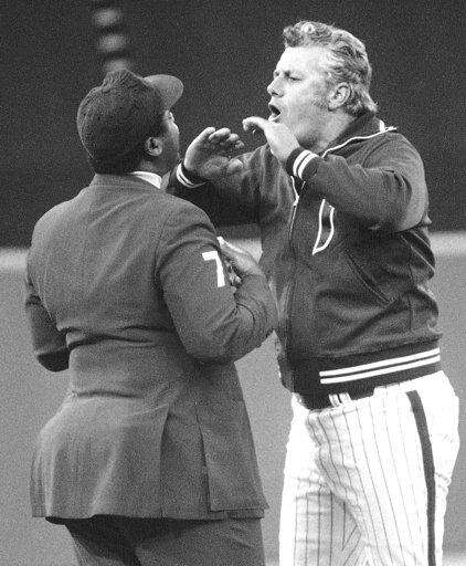 FILE - In this Sept. 21, 1979, file photo, Philadelphia Phillies manager Dallas Green shouts at umpire Eric Gregg after Gregg reversed a decision in favor of the Pittsburgh Pirates during the sixth inning of a baseball game in Philadelphia. Green, the tough-talking manager who guided the Philadelphia Phillies to their first World Series championship, died Wednesday, March 22, 2017, at Hahnemann University Hospital in Philadelphia, the Phillies said. He was 82. Green spent 62 years in baseball as a player, manager, general manager, team president and other roles. (AP Photo/Rusty Kennedy, File) The Associated Press