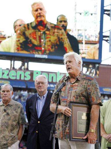 FILE - In this Aug. 11, 2006, file photo, former Philadelphia Phillies manager Dallas Green addresses the crowd after being inducted into the baseball team's Hall of Fame in Philadelphia. Green, the tough-talking manager who guided the Philadelphia Phillies to their first World Series championship, died Wednesday, March 22, 2017, at Hahnemann University Hospital in Philadelphia, the Phillies said. He was 82. Green spent 62 years in baseball as a player, manager, general manager, team president and other roles.(AP Photo/Rusty Kennedy, File) The Associated Press