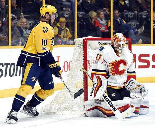Calgary Flames goalie Chad Johnson (31) blocks a shot as Nashville Predators center Colton Sissons (10) looks for the rebound during second period of an NHL hockey game Thursday, March 23, 2017, in Nashville, Tenn. (AP Photo/Mark Zaleski) The Associated Press