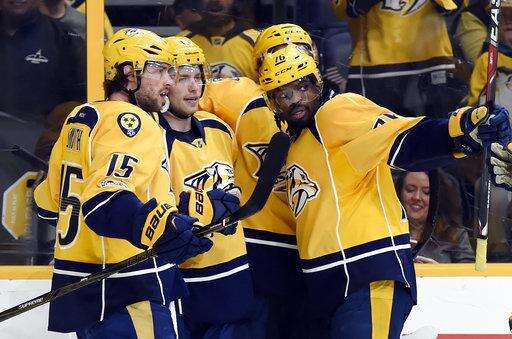 Nashville Predators center Colton Sissons, center, celebrates with right wing Craig Smith (15) and defenseman P.K. Subban (76) after Sissons scored a goal against the Calgary Flames during second period of an NHL hockey game Thursday, March 23, 2017, in Nashville, Tenn. (AP Photo/Mark Zaleski) The Associated Press