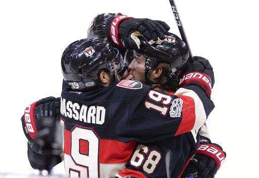 Ottawa Senators' Derick Brassard (19) celebrates his teammate Mike Hoffman's (68) tying goal against the Pittsburgh Penguins during the third period of an NHL hockey game in Ottawa, Ontario, Thursday, March 23, 2017. Ottawa won, 2-1, in the shootout. (Justin Tang/The Canadian Press via AP) The Associated Press