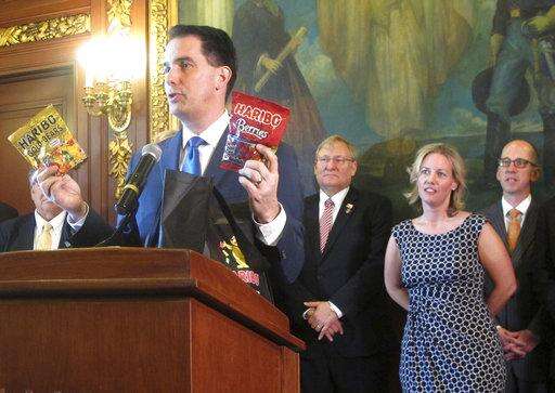 Wisconsin Gov. Scott Walker holds up two bags of Haribo candy when announcing the German-based company would be building its first North American manufacturing plant in southeast Wisconsin not far from Chicago on Thursday, March 23, 2017, in Madison, Wis. (AP Photo/Scott Bauer)