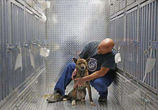 A dog rescued from a South Korean dog meat farm gets some affection from David Manko, a volunteer for the Pittsburgh Aviation Animal Rescue Team aboard their animal transport vehicle near Kennedy Airport Sunday, March 26, 2017, in the Queens borough of New York. The Humane Society International is responsible for saving 46 dogs that would otherwise have been slaughtered. Humane Society officials said the dogs that arrived in New York late Saturday night had awaited death in dirty, dark cages, and were fed barely enough to survive at a farm in Goyang, South Korea. (Humane Society International/Andrew Kelly via AP)
