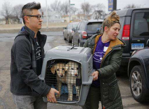 A crate holding two puppies rescued from a South Korean dog meat farm are loaded onto an animal transport vehicle near Kennedy Airport by Animal Haven Director of Operations Mantat Wong, left, and volunteer Nicole Smith Sunday, March 26, 2017, in the Queens borough of New York. The Humane Society International is responsible for saving 46 dogs that would otherwise have been slaughtered. Humane Society officials said the dogs that arrived in New York late Saturday night had awaited death in dirty, dark cages, and were fed barely enough to survive at a farm in Goyang, South Korea. (Humane Society International/Andrew Kelly via AP)