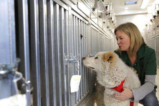 Humane Society International's Director of Companion Animals and Engagement Kelly O'Meara holds a dog named Walter, who was rescued from a South Korean dog meat farm, as he greets another rescued dog aboard an animal transport vehicle near Kennedy Airport Sunday, March 26, 2017, in the Queens borough of New York. The Humane Society International is responsible for saving 46 dogs that would otherwise have been slaughtered. Humane Society officials said the dogs that arrived in New York late Saturday night had awaited death in dirty, dark cages, and were fed barely enough to survive at a farm in Goyang, South Korea. (Humane Society International/Andrew Kelly via AP)