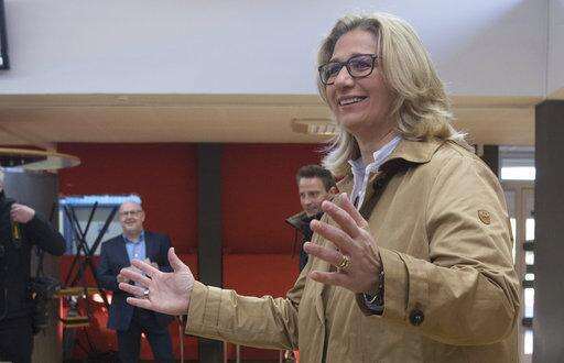 Top candidate of the Social Democrats, SPD, Anke Rehlinger gestures after casting her vote for Saarland's state election in Nunkirchen, Germany, Sunday, March 26, 2017. The state election in the western German state offers German Chancellor Angela Merkel's conservatives a tough test against their resurgent center-left rivals six months before Merkel seeks a fourth term in a national vote. (Boris Roessler/dpa via AP)