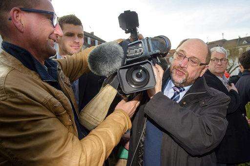 German Social Democrat chancellor candidate Martin Schulz shoulders a camera for a camera man of a television team at the St. Johanner Market in Saarbruecken, Germany, Friday, March 24, 2017. Schulz is visiting the German state of Saarland as part of the campaign for regional elections there on March 26 . (Oliver Dietze/dpa via AP)