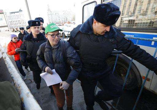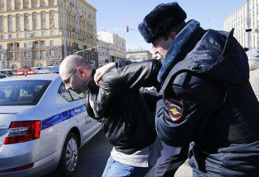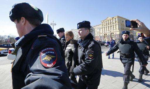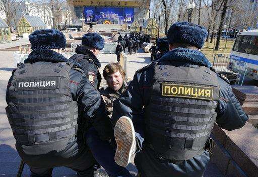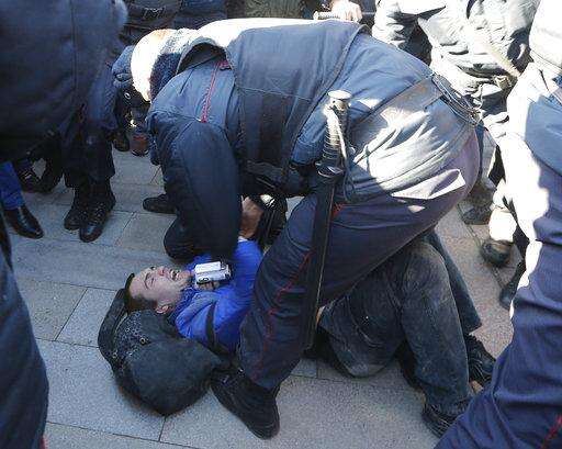 Police detain a protester in downtown Moscow, Russia, Sunday, March 26, 2017. Russia's leading opposition figure Alexei Navalny and his supporters aim to hold anti-corruption demonstrations throughout Russia. But authorities are denying permission and police have warned they won't be responsible for "negative consequences" or unsanctioned gatherings. (AP Photo/Alexander Zemlianichenko)
